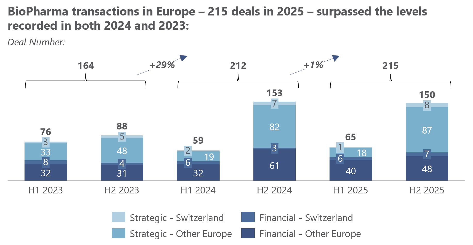 Biopharma transactions in Europe rose to 215 deals in 2025, with a significant increase in deals exceeding EUR 1 billion.