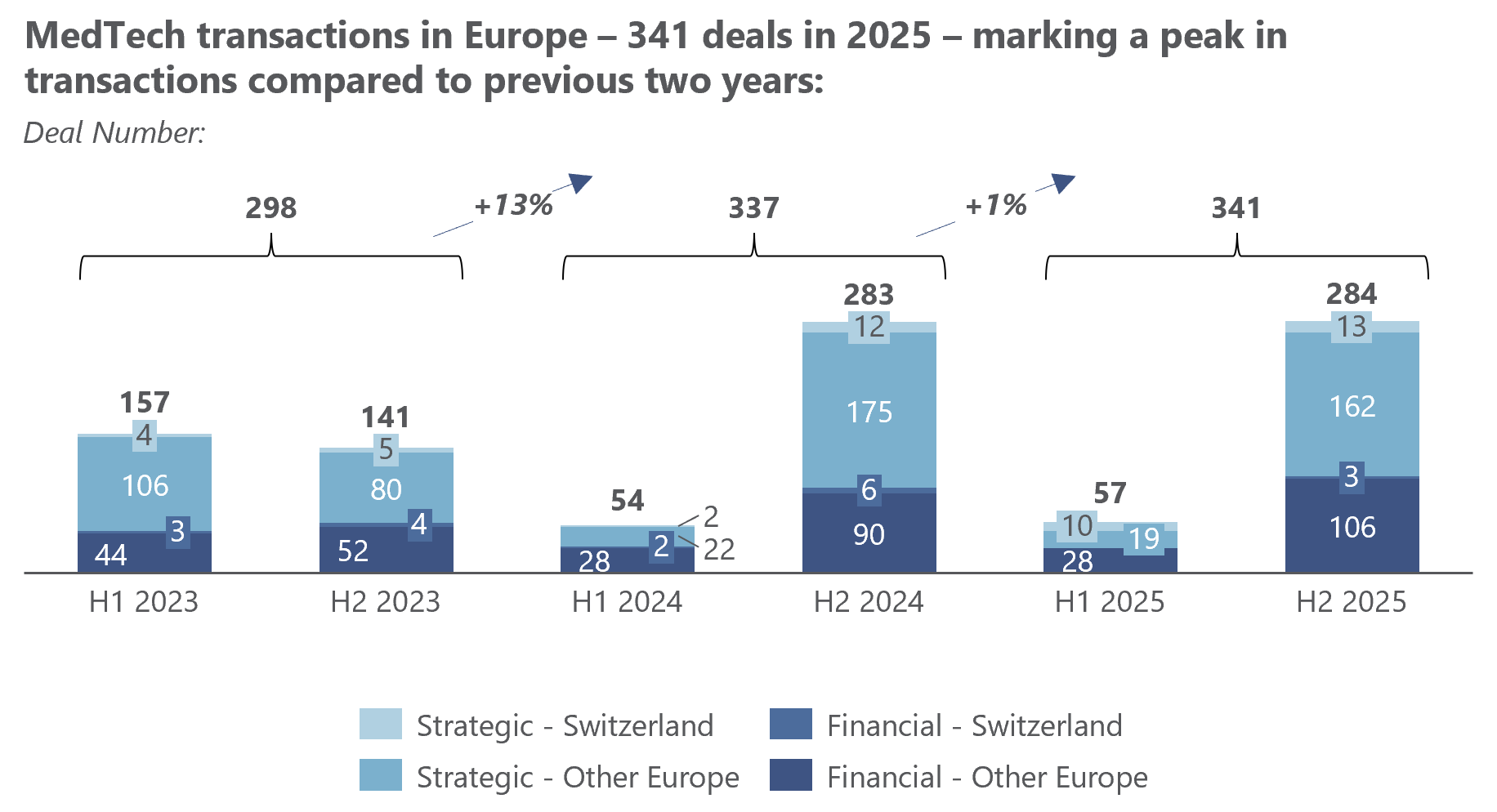 At the same time, AI integration, robotics, and patient-centered care models are opening up new growth opportunities. The number of M&A transactions in Europe reached a new high of 341 deals in 2025 – a sign that consolidation pressure, as well as strategic opportunities, continue to grow.