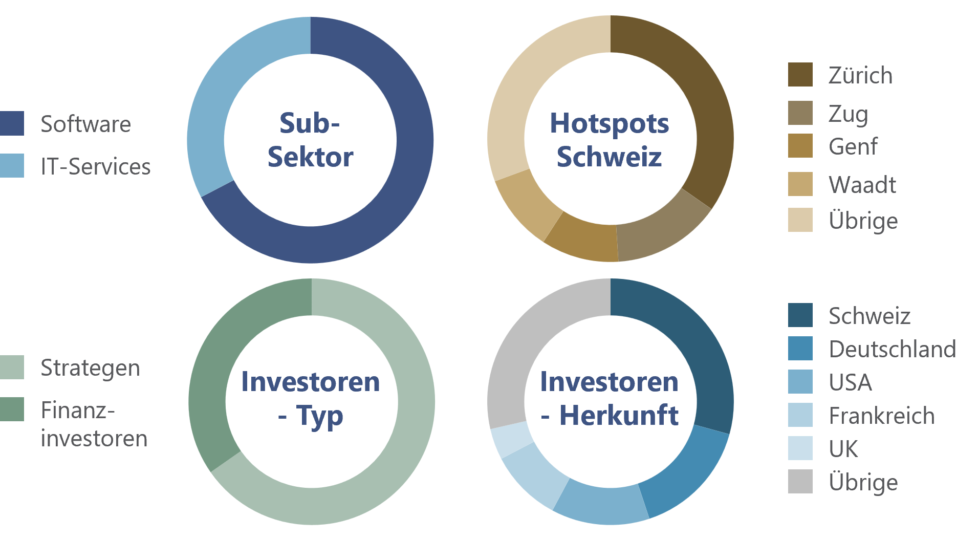 Der Schweizer IT-Sektor ist mit Blick auf M&A-Transaktionen stark von strategischen Käufern geprägt. Zudem sind aktuell im Software-Bereich deutlich mehr Transaktionen zu beobachten als im IT-Services-Bereich. Zürich ist dabei der wichtigste Schweizer Hotspot, gefolgt vom Kanton Zug und den Westschweizer Hotspots Genf und Waadt.
