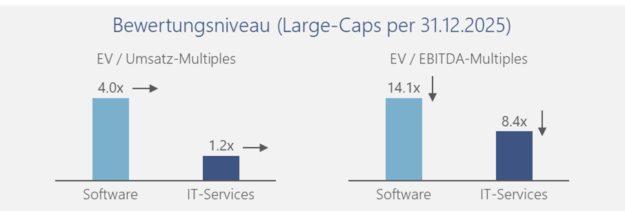Software-Unternehmen werden nach wie vor mit höheren Multiples bewertet als Firmen im IT-Services-Bereich. In beiden Sub-Sektoren ist ein Rückgang bei den EV / EBITDA-Multiples gegenüber dem Vorjahr zu beobachten.