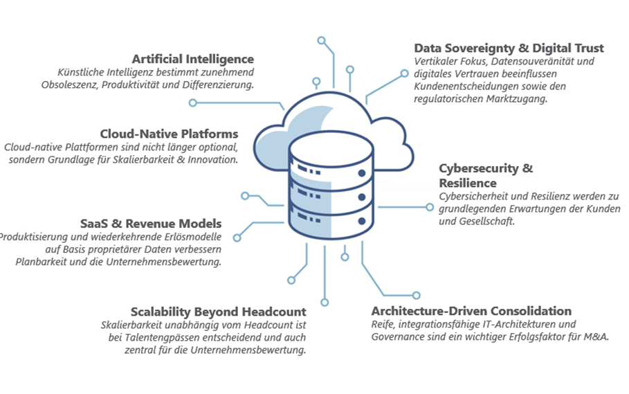 IT-Dienstleister stehen unter zunehmendem Druck, sich von Wachstumsmodellen auf Basis von Personalaufbau zu lösen. Automatisierung, vertikale Spezialisierung, KI-gestützte Leistungserbringung sowie Managed-Services-Modelle werden zu zentralen Erfolgsfaktoren aus einer Transaktionsperspektive. Gleichzeitig definieren Datensouveränität und die wachsende Bedeutung von Vertrauen (Sicherheit, Verlässlichkeit und Compliance) neue Anforderungen. Letzteres begünstigt insbesondere lokal verankerte, auf Verticals (Sektoren) fokussierte Anbieter mit bewährten und vertrauenswürdigen Operating Models.